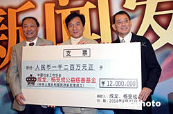 八月二十一日,成龍、楊受成公益慈善基金在北京人民大會(huì)堂成立。國(guó)際著名影星成龍和香港英皇集團(tuán)主席楊受成捐助一千二百萬元人民幣為創(chuàng)始基金,用于中國(guó)老人、婦女、兒童、及貧困人員的公益慈善事業(yè)。中新社記者:史利