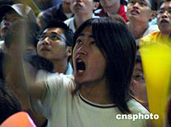 中國臺(tái)北隊(duì)在雅典奧運(yùn)會(huì)棒球賽中3:4惜敗日本隊(duì),臺(tái)北球迷為之惋惜。中新社記者:曾嘉