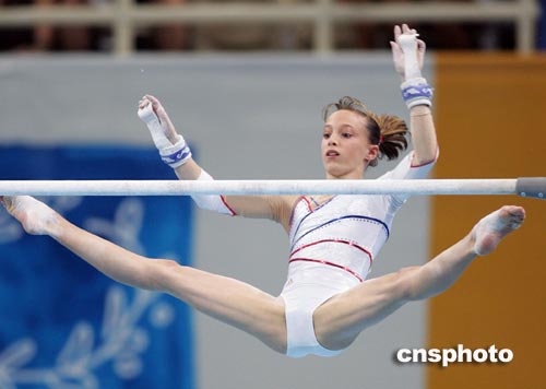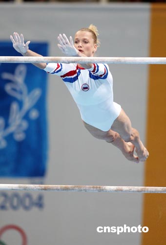 最有希望在高低杠項目中奪取一枚雅典奧運金牌的俄羅斯“冰美人”霍爾金娜,今天決賽前半程的發(fā)揮非常出色,其動作連接編排巧妙,極具觀賞性。但遺憾的是,她在做一個杠上倒立轉身動作時,反手沒有抓住器械,只得下杠后再重新上器械完成后面的動作,是八人中唯一出現(xiàn)較大失誤的選手。