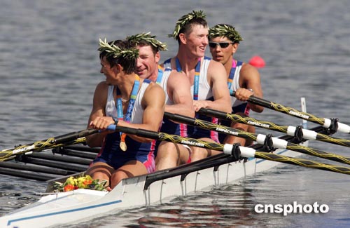 當?shù)貢r間八月二十二日,俄羅斯隊在雅典奧運四人雙槳賽艇比賽中獲得冠軍。中新社記者:毛建軍