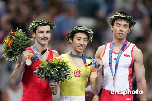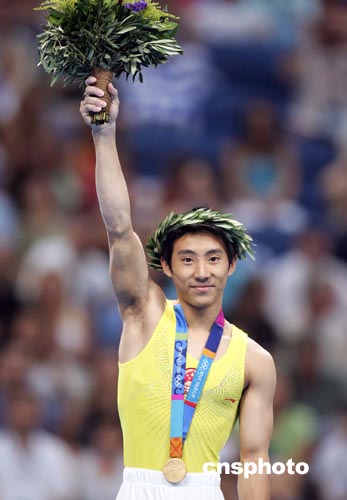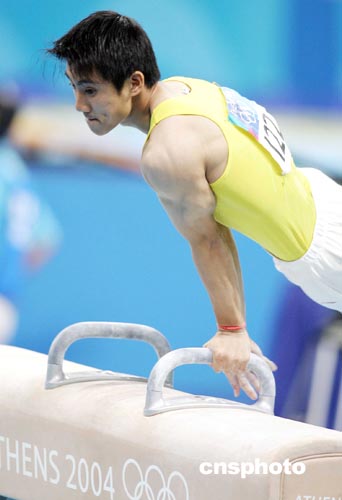 當?shù)貢r間八月二十二日晚,中國體操選手滕海濱以9.837分獲得雅典奧運男子鞍馬冠軍,為中國體操隊奪得本屆奧運會第一枚金牌。中新社記者:毛建軍