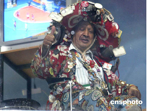 圖為在當(dāng)?shù)貢r(shí)間8月22日舉行的女子72公斤級摔跤比賽中,一位裝束奇異的支持者出現(xiàn)在后臺。