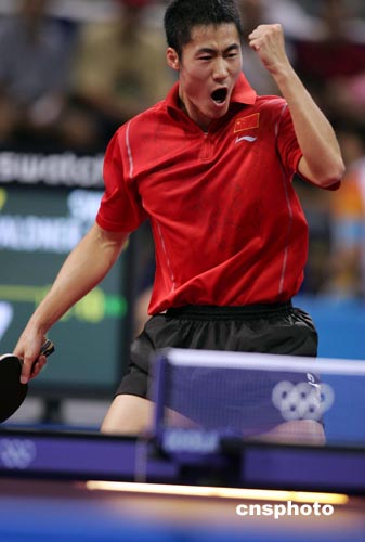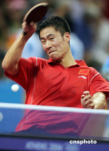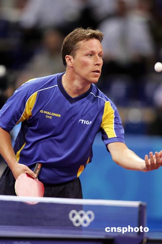 當?shù)貢r間八月二十三日下午,在雅典奧運乒乓球男子單打決賽中,中國選手王勵勤戰(zhàn)勝瑞典老將瓦爾德內(nèi)爾獲得銅牌。中新社記者:毛建軍