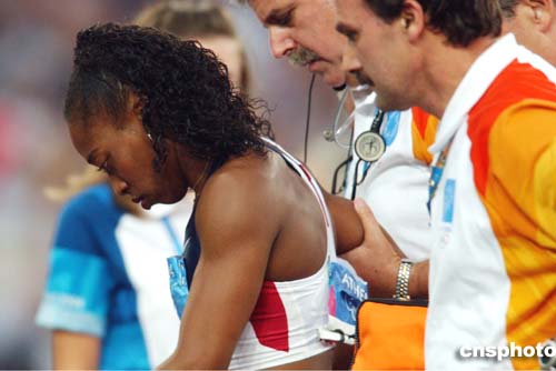 在當(dāng)?shù)貢r間22進(jìn)行的女子100米跨欄比賽中,美國選手Gail Devers因摔倒而不得不離開賽場。