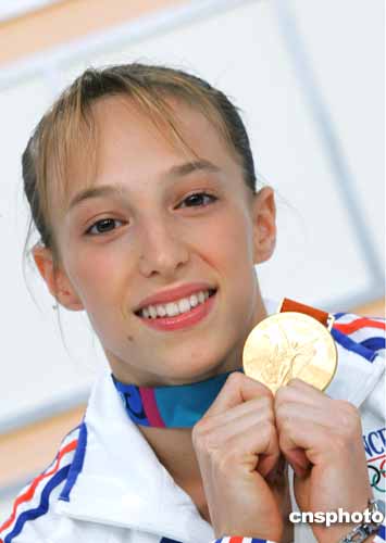在當(dāng)?shù)貢r(shí)間23日進(jìn)行的女子體操個(gè)人器械比賽中,霍爾金娜出現(xiàn)重大失誤,法國選手勒配內(nèi)奇取得高低杠項(xiàng)目的金牌。圖為她向觀眾展示金牌的鏡頭。