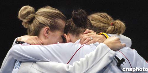 當?shù)貢r間22日,加拿大在同法國爭奪銅牌的擊劍團體比賽中失敗。圖為賽后她們相互擁抱的場面。