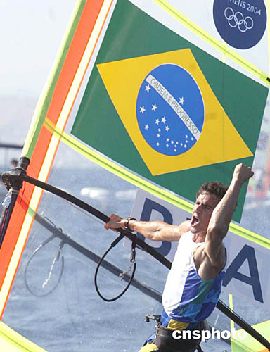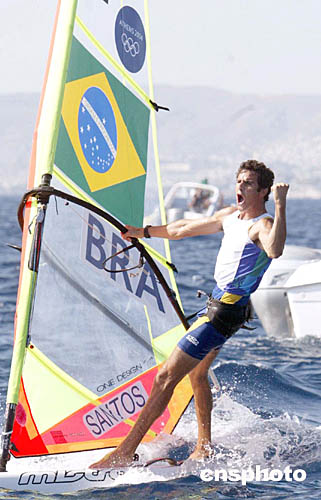 圖為巴西選手SANTOS Ricardo在當(dāng)?shù)貢r間8月23日舉行的帆船帆板比賽中的表現(xiàn)。