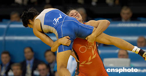 圖為在當(dāng)?shù)貢r間8月23日舉行的女子72公斤級比賽中,日本選手KAORI ICHO以3比2戰(zhàn)勝美國選手SARA MCMANN奪得冠軍。圖為她們在比賽中的場面。