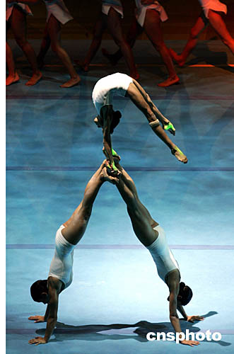 圖為在當(dāng)?shù)貢r間8月24的體操展覽館里孩子們的精彩表演。