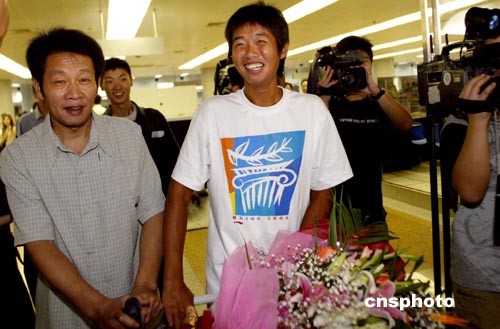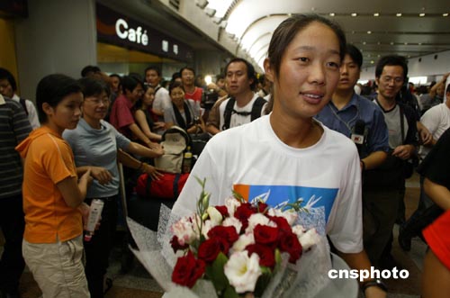 8月25日,在雅典奧運會奪得女子網(wǎng)球雙打冠軍的李婷、孫甜甜載譽回京,在北京首都國際機場受到熱烈的歡迎。中新社記者:盛佳鵬