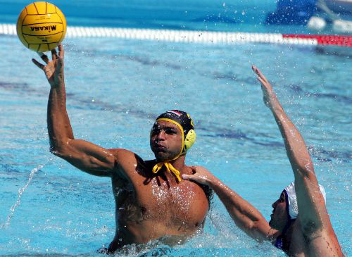 當(dāng)?shù)貢r間8月25日上午,雅典奧運會男子水球比賽進(jìn)入白熱化階段,非洲冠軍埃及隊(黑帽)雖然竭盡全力防守和進(jìn)攻,但是由于實力差距較大而以1比12的懸殊比分負(fù)于克羅地亞隊。比賽中,一名克羅地亞隊員在對方門射門時用手強行按下對手肩膀,雖然被判犯規(guī),但阻止了對方一次頗有危險的射門。 作者:任晨鳴