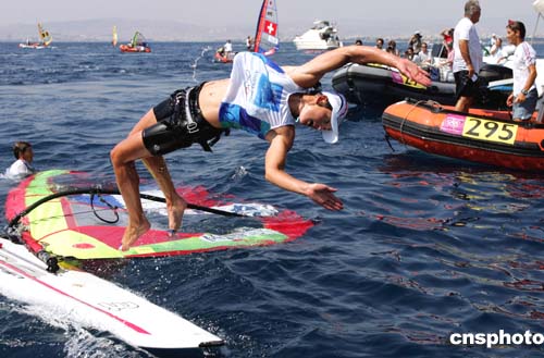 在當(dāng)?shù)貢r(shí)間8月25日進(jìn)行的女子帆船帆板米斯特拉級(jí)比賽中,法國選手馬萊特奪取金牌。