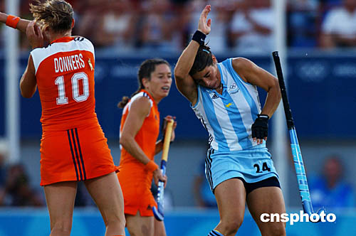 圖為在當(dāng)?shù)貢r(shí)間8月24日舉行的女子曲棍球荷蘭隊(duì)與阿根廷的比賽現(xiàn)場(chǎng)畫面。最后荷蘭隊(duì)以3比2戰(zhàn)勝阿根廷隊(duì)取得勝利。
