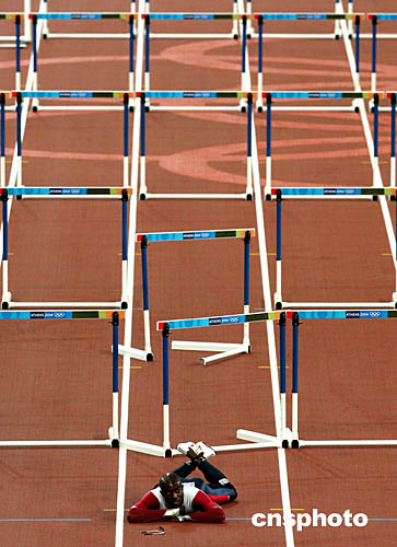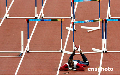 圖為美國名將阿蘭.約翰遜(Allen Johnson)在男子110米欄的半決賽中摔倒無緣決賽。