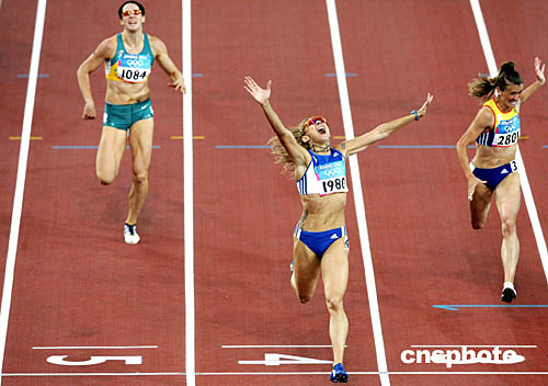 圖為希臘選手Fani Halkia戰(zhàn)勝烏克蘭的Tetiana Tereshchuk-Antipova和澳大利亞的Jana Pittman第一個(gè)沖過(guò)終點(diǎn),奪得女子400米欄的冠軍。