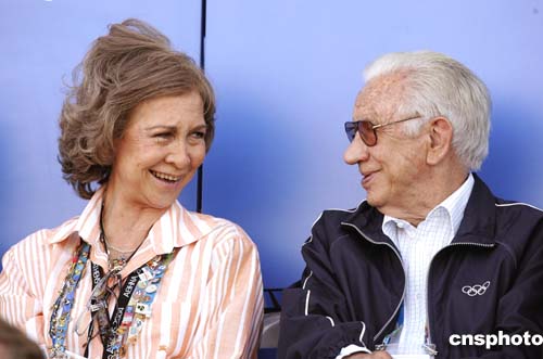 圖為西班牙王后索非亞與薩馬蘭奇在賽場(chǎng)邊親切交談的場(chǎng)面。