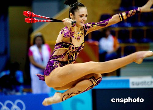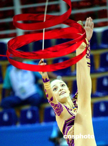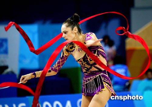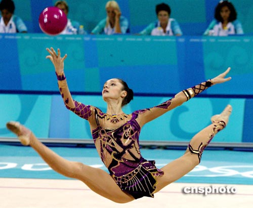 雅典當(dāng)?shù)貢r間八月二十五日,俄羅斯藝術(shù)體操個人全能選手KABAEVA進行奧運會賽前排練。中新社記者:王瑤