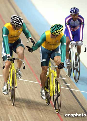 在當(dāng)?shù)貢r間25日進(jìn)行的男子場地自行車凱林賽中,澳大利亞選手拜雷和凱利分獲金牌與銅牌。圖為他們相互慶祝的場面。
