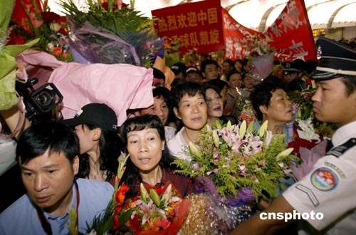 8月26日,北京首都國際機場又迎來一批載譽歸來的奧運健兒,包括羽毛球、乒乓球、游泳、體操、舉重等200多名選手,他們在機場受到英雄般的歡迎,幾乎每個人都被鮮花包圍。這是大批民眾在機場手持鮮花、歡迎條幅翹首等待奧運健兒凱旋。中新社記者:盛佳鵬