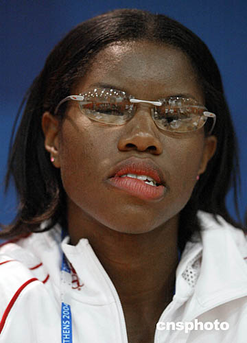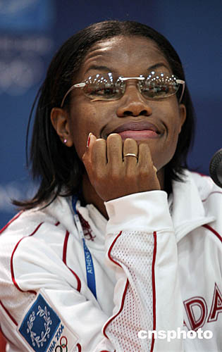 加拿大選手費(fèi)利西安(Perdita Felicien)在雅典奧運(yùn)會(huì)田徑女子100米欄決賽中跨第二個(gè)欄時(shí)摔倒,沒有完成賽程。圖為她出席記者會(huì)時(shí)的鏡頭。