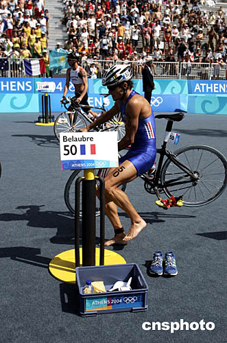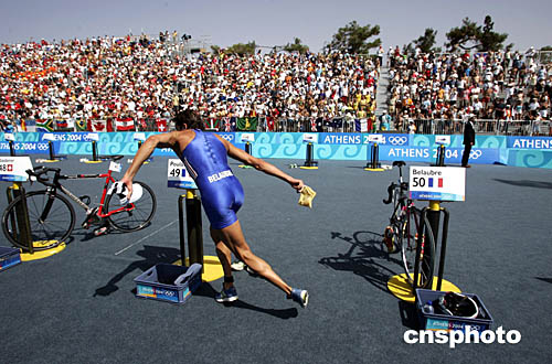 圖為在當?shù)貢r間8月26日舉行的男子三項全能比賽中的一幕。