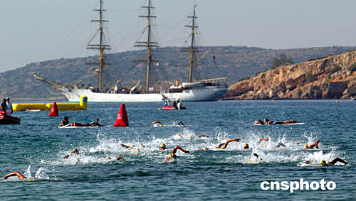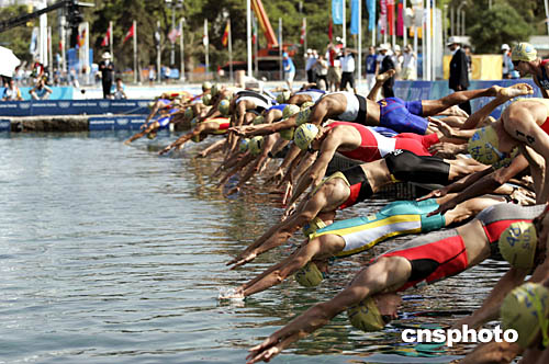 圖為在當(dāng)?shù)貢r(shí)間舉行的男子鐵人三項(xiàng)比賽中選手們的表現(xiàn)。