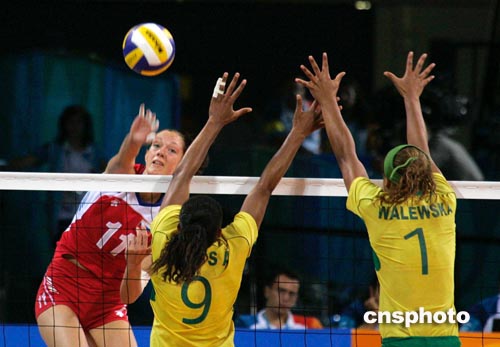 北京時(shí)間8月27日凌晨,俄羅斯女排(紅衫)在雅典奧運(yùn)會(huì)女排半決賽中,在先失兩局的情況下反敗為勝,以3比2淘汰強(qiáng)勁對(duì)手巴西隊(duì)進(jìn)入決賽。中新社記者:張煒