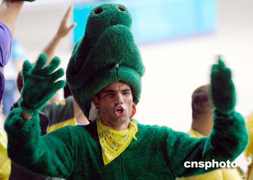 北京時(shí)間8月27日凌晨,俄羅斯、巴西女排在雅典奧運(yùn)會(huì)女排半決賽中爭奪進(jìn)入決賽的資格。圖為打扮成“大灰狼”的巴西球迷在為本國球隊(duì)吶喊助威。中新社記者:張煒