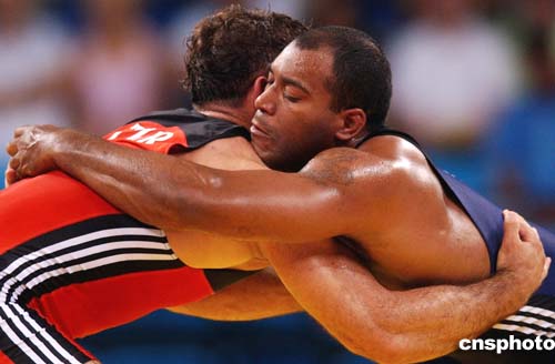 圖為當(dāng)?shù)貢r(shí)間26日舉行的男子古典式96公斤級(jí)摔交比賽中,Mehmet Ozal與Ernesto Pena的精彩搏斗。