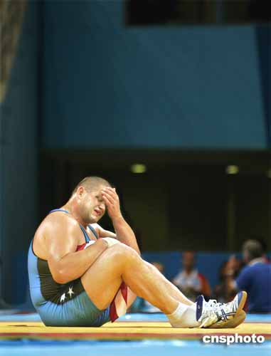 圖為美國(guó)選手Rulon Gardner抱著美國(guó)國(guó)旗坐在比賽場(chǎng)地上,他將在此結(jié)束自己的摔交生涯。當(dāng)把鞋脫下留在毯子上時(shí),他再也難掩內(nèi)心的傷感。