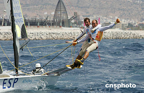 圖為西班牙選手Iker Martinez和Xavier Fernandez奪得帆船49人級(jí)冠軍后異常興奮。