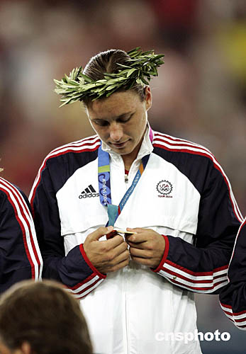 圖為在擊敗巴西隊(duì)奪得雅典奧運(yùn)會(huì)女足比賽冠軍后,美國(guó)隊(duì)隊(duì)員艾比·瓦姆巴奇(Abby Wambach)在端詳自己金牌的鏡頭。