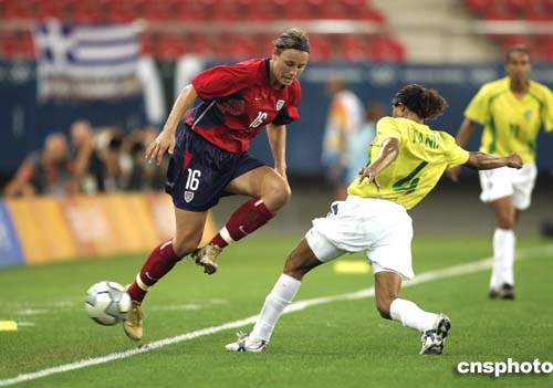 圖為在當?shù)貢r間26日舉行的女足決賽中,巴西隊員Tania的表現(xiàn)。