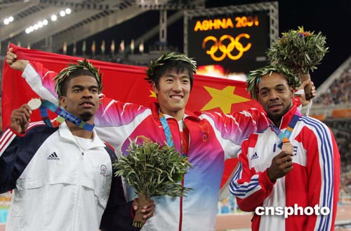 當(dāng)?shù)貢r(shí)間八月二十七日晚,在雅典奧運(yùn)會(huì)男子一百一十米欄比賽中,中國(guó)選手劉翔以十二秒九一的成績(jī)獲得冠軍并打破奧運(yùn)會(huì)紀(jì)錄。中新社記者:毛建軍