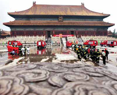 故宮消防中隊出動兩名搶險員,搶救被燒物資,同時府右街消防中隊派出兩副擔架,從殿內(nèi)“火!敝芯瘸鰞擅皞麊T”;ㄊ邢乐嘘牭臄(shù)名消防員,在殿內(nèi)架起兩節(jié)梯,從內(nèi)部滅火。
