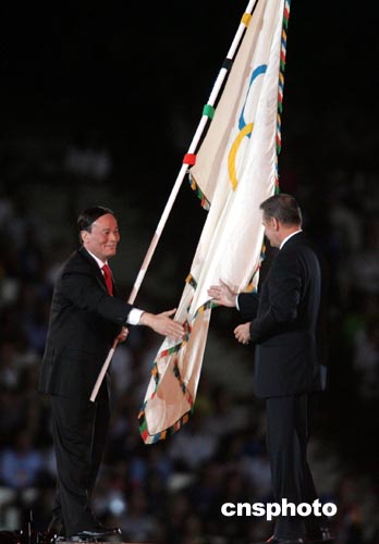 羅格說,“四年后,讓我們在北京相聚!彼麖难诺涫虚L巴科揚尼斯手中接過奧運會會旗,然后把會旗交在北京市市長王岐山手中。