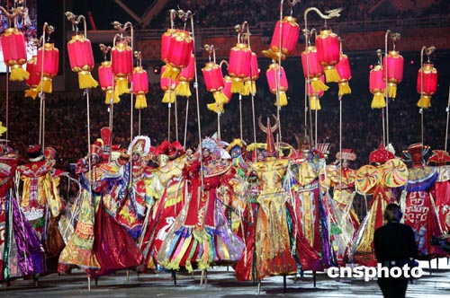 二十八名來自嵩山少林寺武術(shù)學(xué)校的學(xué)員腳踩高蹺,手中挑著二十八只大紅燈籠,在演出中心區(qū)穿行表演,傳遞中國(guó)人民歡迎奧運(yùn)會(huì)的熱情。