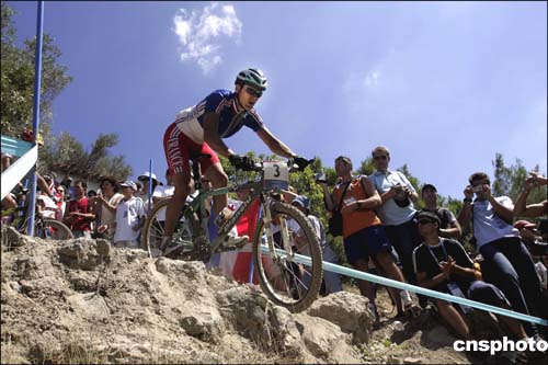 在當?shù)貢r間28日進行的山地男子自行車越野比賽中,法國選手阿布薩隆用時2小時15分03秒,獲得冠軍。