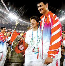 閉幕式上,為中國隊(duì)打旗的人變成了奪得110米欄金牌的劉翔,他與希臘旗手雙雙走在最前列。姚明葉莉兩人則“藏身”在后邊的大部隊(duì)中,姚明身穿中國代表團(tuán)的紅色外套,葉莉一身白色T恤,身后寫著“相聚北京2008”的字樣。兩人剛進(jìn)場時(shí),姚明甚至親昵地將手搭在女友的肩膀上。身高1.90米的葉莉在身高2.26米的姚明映襯下,顯得嬌小可人。