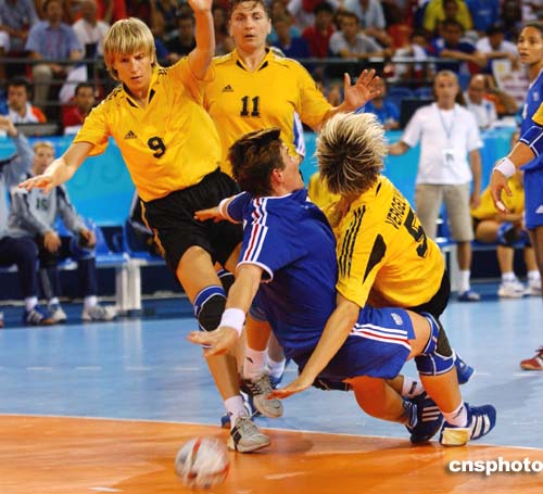 圖為當(dāng)?shù)貢r(shí)間28日,法國隊(duì)與韓國隊(duì)在手球比賽場上的爭奪。