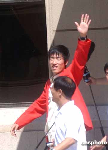 中國飛人、奧運110米欄冠軍劉翔向在北京首都國際機(jī)場歡迎的民眾揮手致意。中新社記者:武仲林