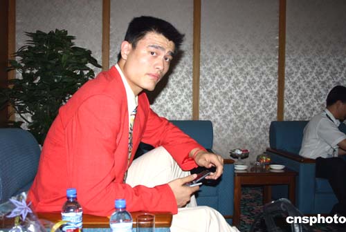 8月31日,中國奧運(yùn)健兒載譽(yù)回京,對(duì)中國男籃成績(jī)不滿意的“小巨人”姚明避開外面的熱鬧歡迎場(chǎng)面在休息室里擺弄手機(jī)。作者:韓藝冰