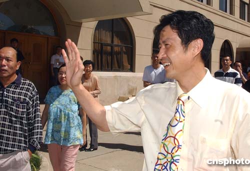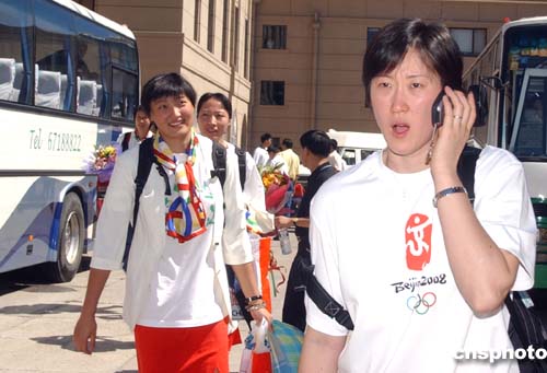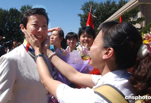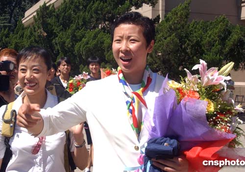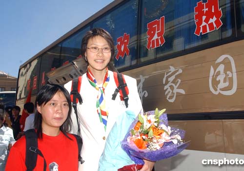 八月三十一日,獲得雅典奧運(yùn)冠軍的中國(guó)女排姑娘們載譽(yù)回京,在北京首都國(guó)際機(jī)場(chǎng)受到各界熱烈歡迎。中新社記者:武仲林