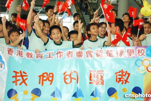 在香港國際機場舉行的歡迎儀式上,眾多香港小朋友舉著標(biāo)語熱烈歡迎香港奧運代表團返港。作者:錢興強