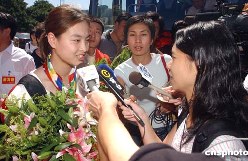 八月三十一日,中國奧運健兒載譽回國,在北京首都國際機(jī)場受到熱烈歡迎。圖為奧運跳水冠軍吳敏霞在機(jī)場接受媒體采訪。中新社記者:武仲林