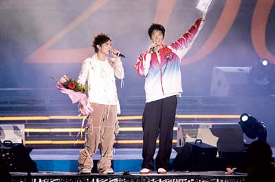 昨晚,相信出現(xiàn)在奧體中心體育場(chǎng)“同一首歌·為奧運(yùn)喝彩”晚會(huì)的觀眾見(jiàn)到的絕對(duì)是史無(wú)前例的黃金歌手組合。首先出場(chǎng)的是著名歌手孫楠和他的最新搭檔——中國(guó)羽毛球隊(duì)金牌教練李永波,兩位嗓音同樣出色的大腕演唱的《紅旗飄飄》,贏得滿(mǎn)場(chǎng)喝彩。青春偶像張柏芝當(dāng)晚的搭檔是萬(wàn)米長(zhǎng)跑奧運(yùn)冠軍邢慧娜。張柏芝說(shuō)想親吻一下那塊金牌,邢慧娜俏皮地說(shuō):“我沒(méi)帶,不過(guò)你唱歌給我聽(tīng),我就讓你親!庇谑牵瑑扇艘煌堇[了一首《星語(yǔ)心愿》讓大家過(guò)了把癮。之后還有孫國(guó)慶、李春波、黃鶴祥等歌手和奧運(yùn)冠軍們演繹的精彩節(jié)目。