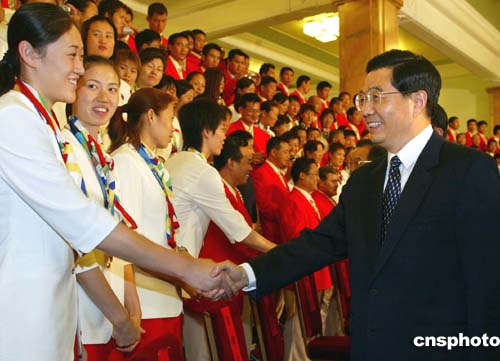 中新網(wǎng)北京九月二日電(記者李靜 翁陽) 快訊:中央領導今天下午三點在人民大會堂親切接見了中國體育代表團全體成員、后勤工作人員及參與報道工作的新聞工作者代表。胡錦濤發(fā)表講話。