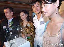 瑞士名表MILUS九月三日在香港舉行發(fā)布會,展示其價值高達99萬的TARASEA鉆石腕表。圖為影星、著名設計師等出席揭幕儀式。作者:錢興強