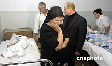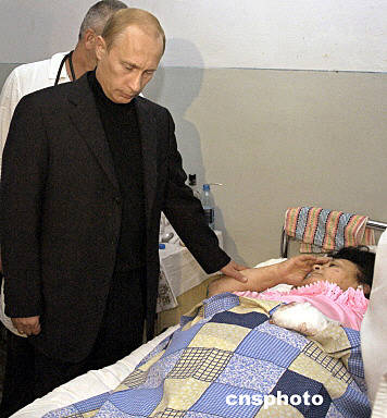 9月4日,俄羅斯總統(tǒng)普京在飛抵北奧塞梯共和國(guó)別斯蘭市后看望在人質(zhì)事件中的受傷人員。隨后,普京與有關(guān)部門領(lǐng)導(dǎo)人舉行緊急會(huì)議,下令封鎖別斯蘭市,關(guān)閉北奧塞梯共和國(guó)的邊境,全力搜捕所有參與劫持人質(zhì)的恐怖分子。俄羅斯聯(lián)邦北奧塞梯共和國(guó)緊急情況部官員4日說,俄人質(zhì)事件中的遇難人數(shù)已上升至250人。