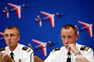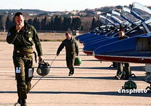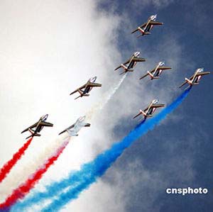 中新網(wǎng)9月7日電 日前,法國空軍飛行表演隊先遣組組長讓·馬克在北京透露,“法蘭西巡邏兵”飛行表演隊10月將隨希拉克總統(tǒng)到訪北京,在北京南苑機場舉行兩場表演,然后赴武漢、珠海、香港巡演。法蘭西巡邏兵是世界五大特級飛行隊之一,此次隨總統(tǒng)出訪是第一次。表演隊使用阿爾法噴氣教練機。此次表演由國防部外事辦公室和空軍有關單位主辦。中新社記者:鄭萍萍
